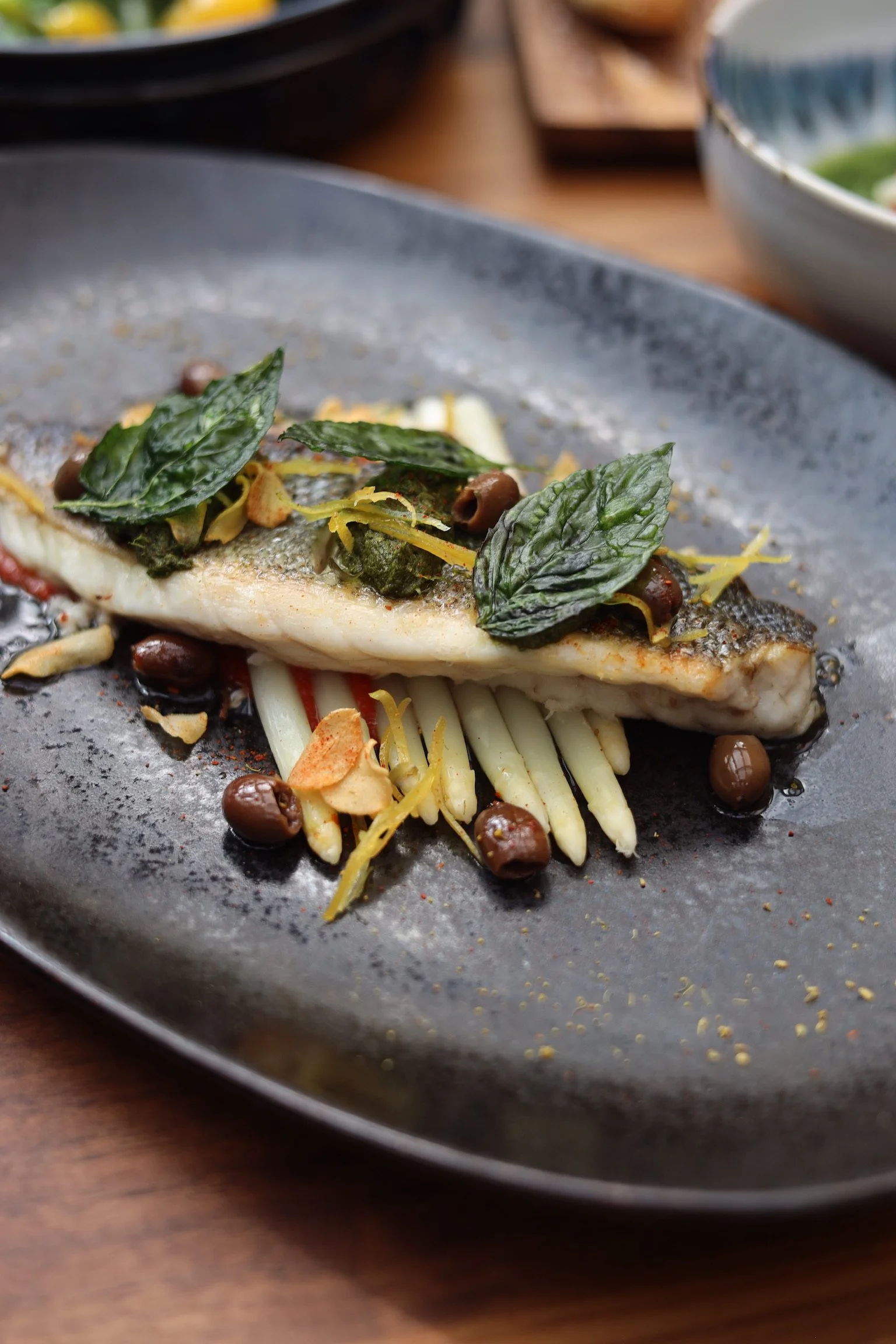 Seared Riviera Branzino. Steamed white asparagus, Taggiasche olives, confit tomato paste, citrus beurre blanc