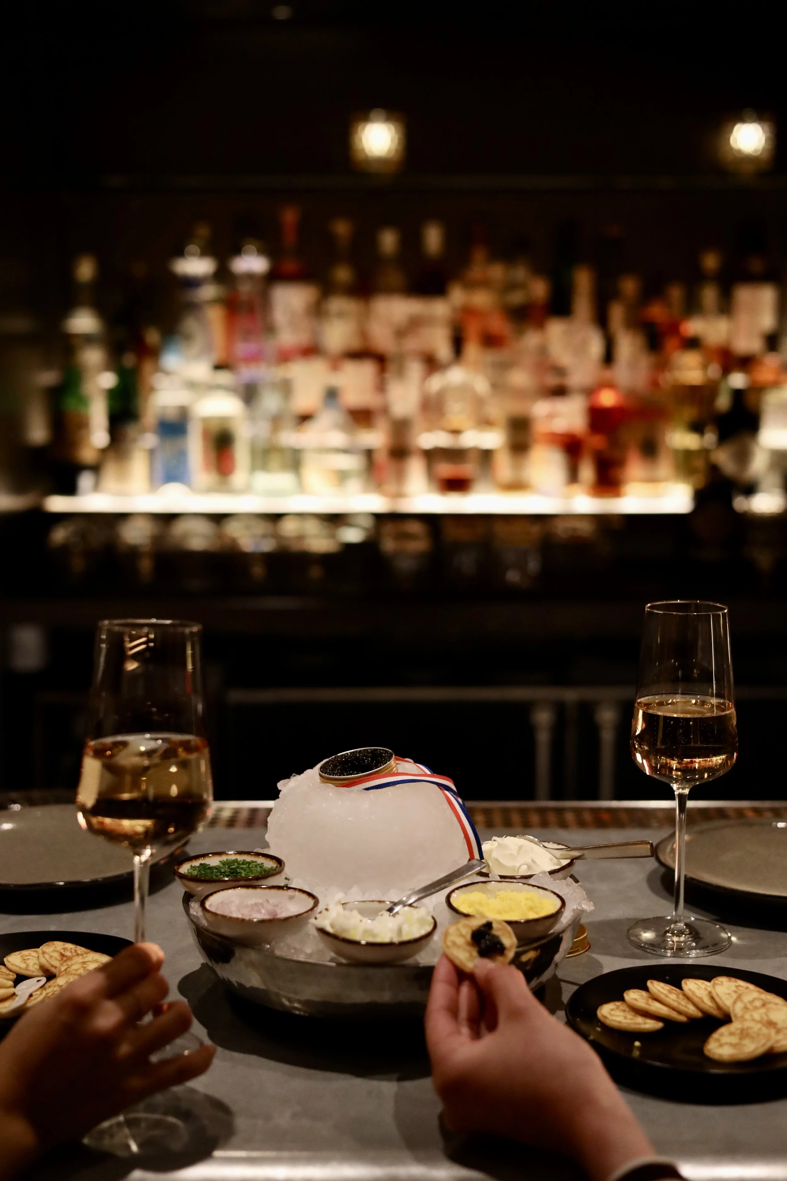 Champagne & Caviar Date Night Offering, available at the zinc-topped bar for a true experience à la Française, perfect for couples seeking a romantic moment of gastronomic elegance.